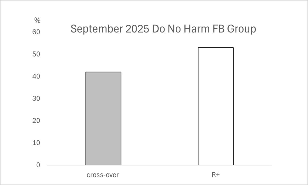 In the Do No Harm group, around 42 % of respondents in my poll said they’d crossed over from coercive to R+ training (so called cross-over trainers). 53% had never practiced coercive training but rather adopted R+ training straight away.
